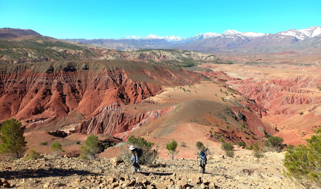 Nous continuons notre randonnée entre des villages rouges construits en pisé sous les amandiers en fleurs. les paysages sont splendides et diversifiés. la nuit dans gîte dans le village de Tighza , 5 heures de marche .