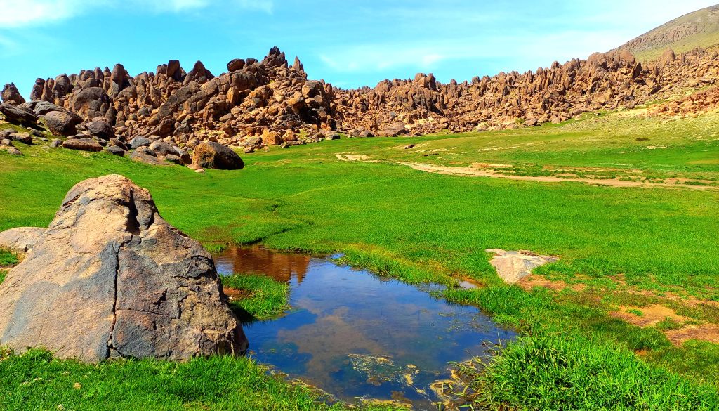 Notre trek se déroule entre 1600 et 3300m d’altitude, dans un massif volcanique de l’Anti-Atlas du Maroc. Durant 4 jours et demi de marche, nous découvrons de belles vallées verdoyantes où des cultures en terrasses du safran dominent la végétation, des prairies (Agdals) avec leurs habitats secondaires sous forme d’agglomérations, des greniers collectifs des villages d’Amassine de Tachakkoucht et d’autres beaux villages construits de pierres taillées au pied de la montagne. En hiver le massif de Sirwa se couvre neige à partir de 1500m d’altitude, et l’ascension requière un grand effort physique et du matériel adapté .